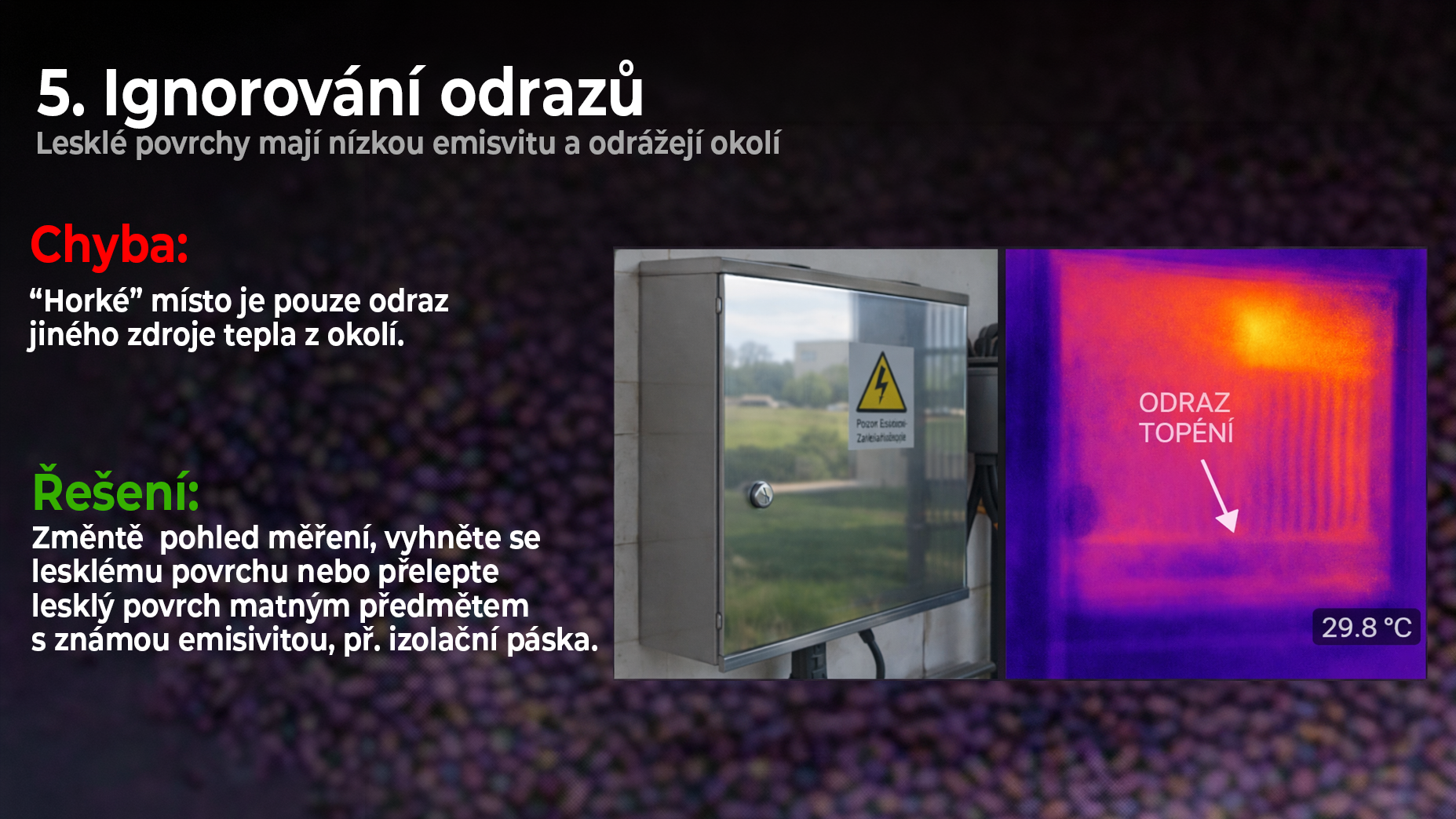 Lesklé povrchy, jako jsou kovové skříně nebo lakované materiály, odrážejí teplo z okolí.Na termálním snímku se pak může objevit „horké místo“, které ve skutečnosti není v měřeném objektu, ale jde o odraz například topení nebo jiného zdroje tepla.