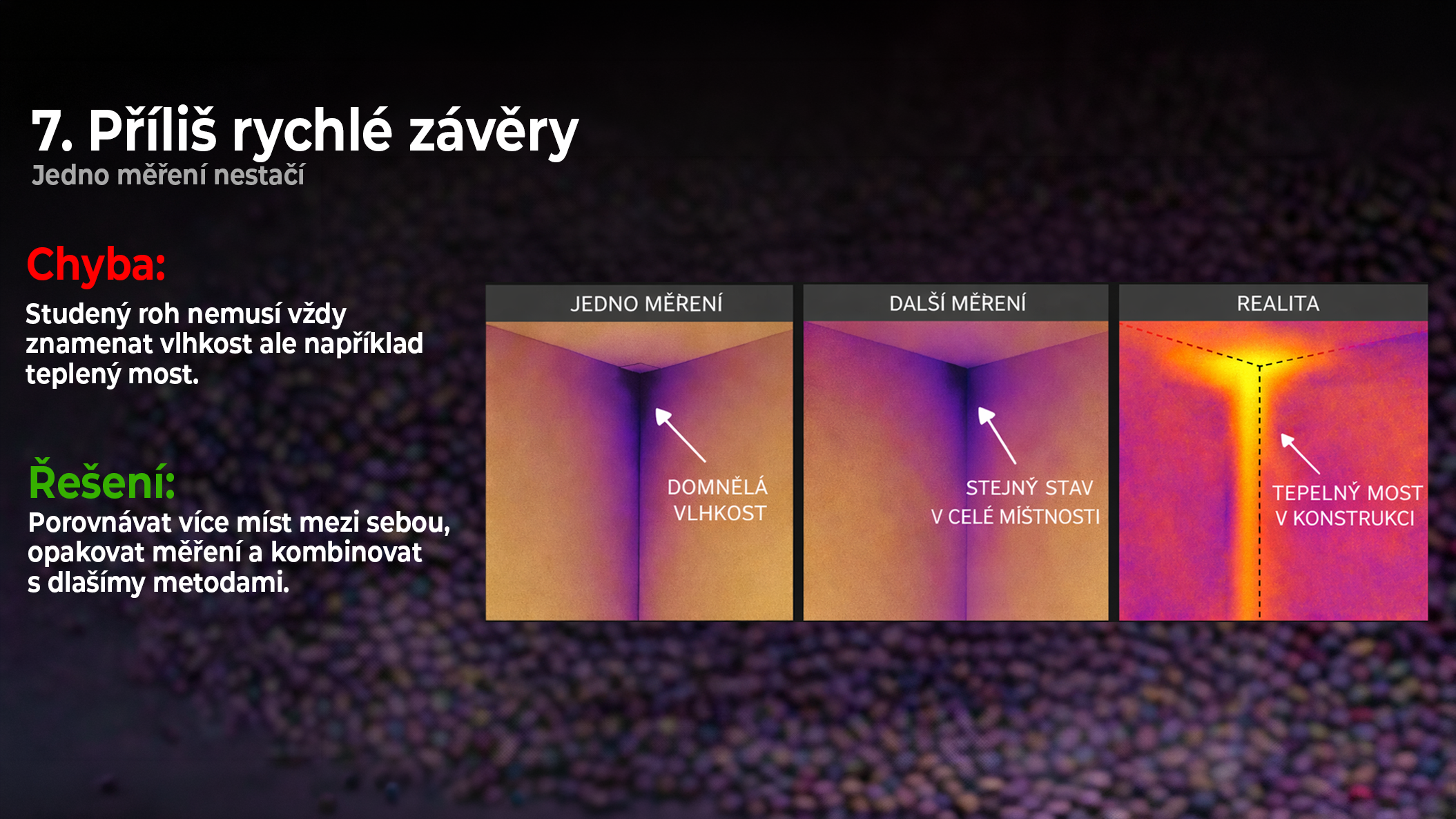 Jedno měření často nestačí k přesné diagnostice. Například studený roh místnosti může být na první pohled vyhodnocen jako vlhkost, ale ve skutečnosti může jít o tepelný most.