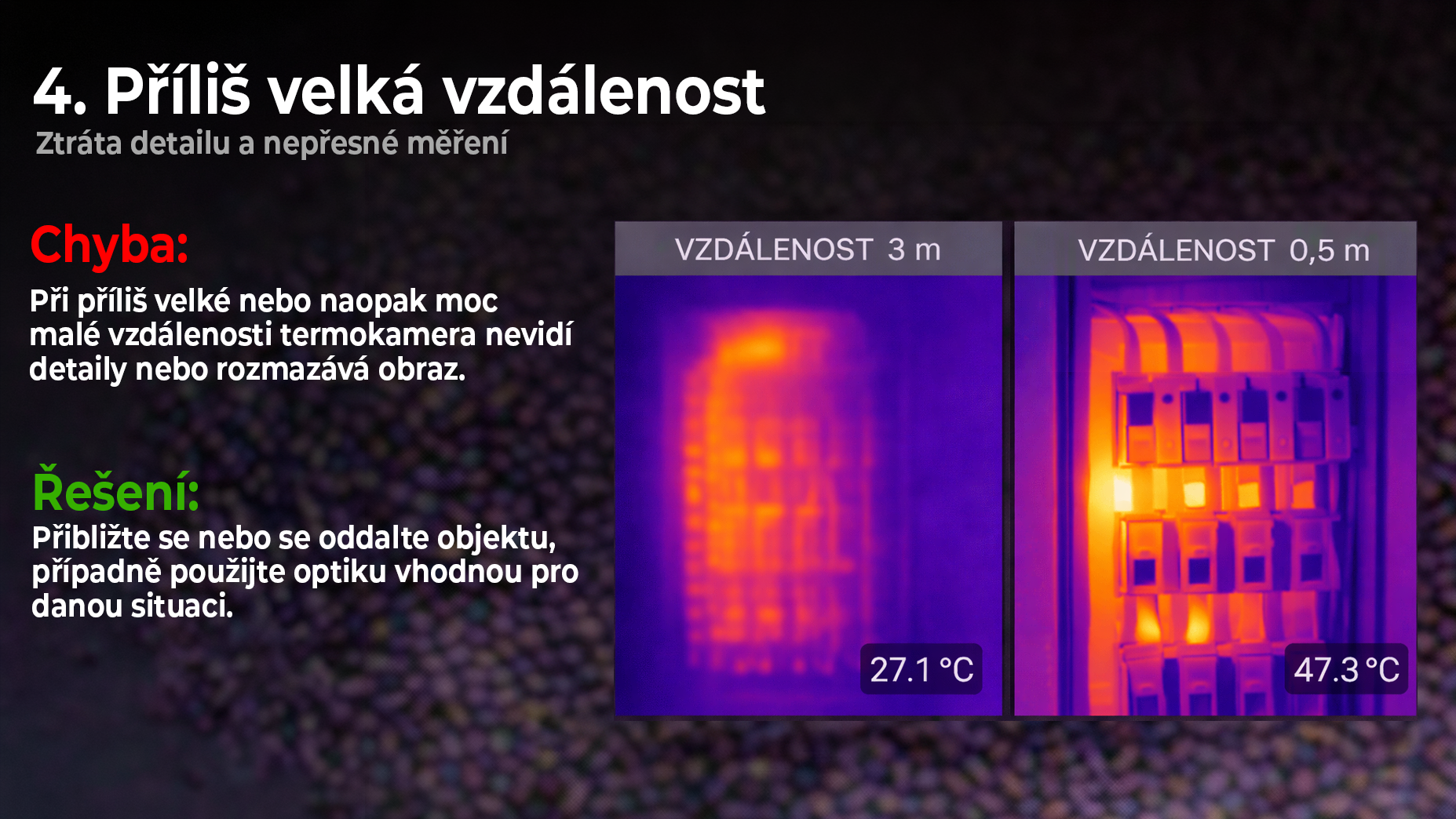 S rostoucí vzdáleností klesá schopnost termokamery zachytit detail. Z větší vzdálenosti může zařízení zobrazit pouze obecnou teplotu oblasti, ale nedokáže identifikovat konkrétní problém – například přehřátý kontakt v rozvaděči. Naopak při moc malé vzdálenosti se obraz nezaostří.