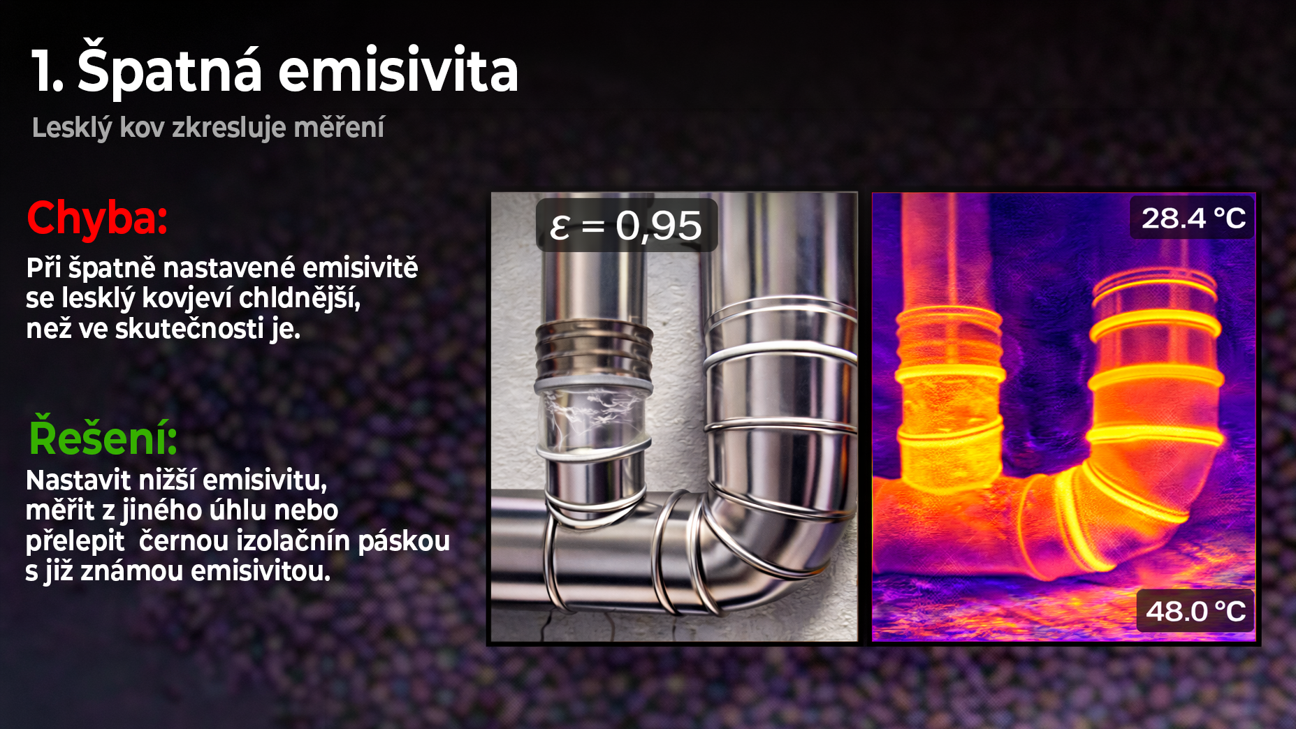 Typickým příkladem je měření kovového potrubí, kde se na termálním snímku objeví chladnější nebo teplejší místo, které ve skutečnosti neexistuje.Řešení je jednoduché – použít správnou emisivitu (např. 0,95 pro běžné materiály) nebo měřit přes matný povrch, například izolační pásku.