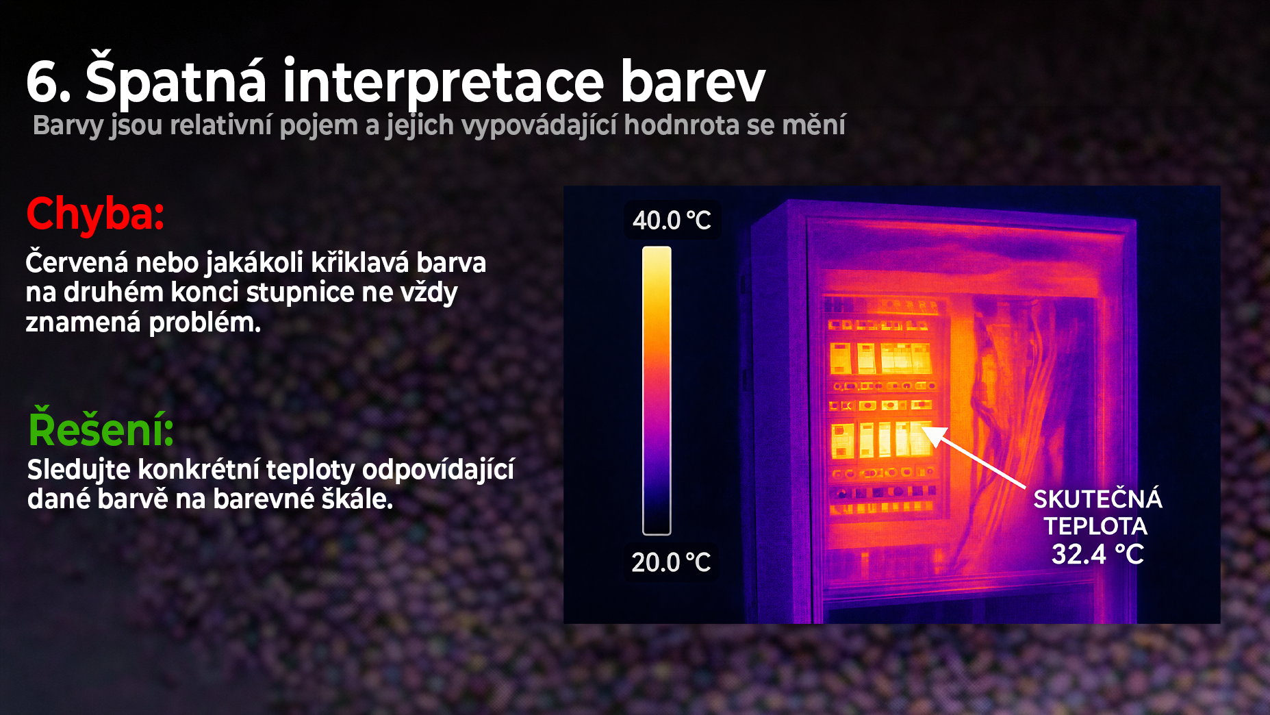 Barvy na termokameře nejsou absolutní ukazatel teploty, ale pouze vizuální reprezentace rozsahu. To znamená, že červená barva nemusí automaticky znamenat problém – pouze označuje nejteplejší místo v rámci aktuální škály.