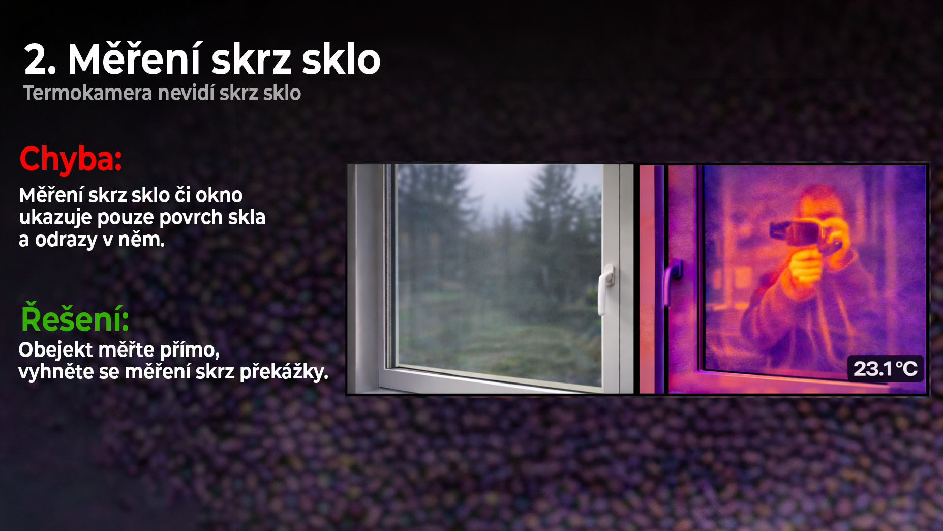 Termokamera nevidí skrz sklo. Měří pouze jeho povrch a zároveň zachycuje odrazy okolí. To znamená, že při měření přes okno neuvidíte venkovní prostředí, ale kombinaci teploty skla a odrazu interiéru – často i vlastní postavy.