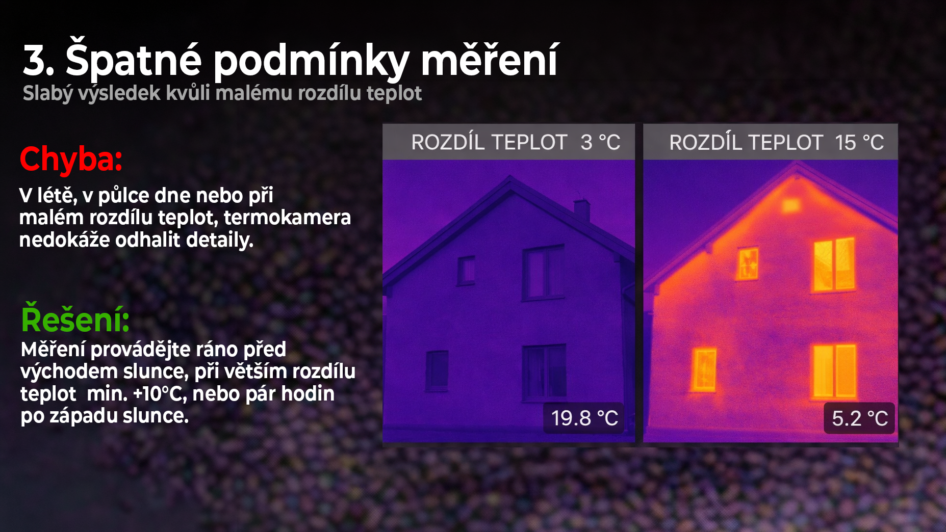 Termokamera funguje na principu rozdílu teplot. Pokud je rozdíl příliš malý, zařízení nedokáže zobrazit detaily. Při malém rozdílu (např. 3 °C) bude obraz plochý a bez výrazných kontrastů. Naopak při větším rozdílu (10–15 °C) jsou problémy jasně viditelné.