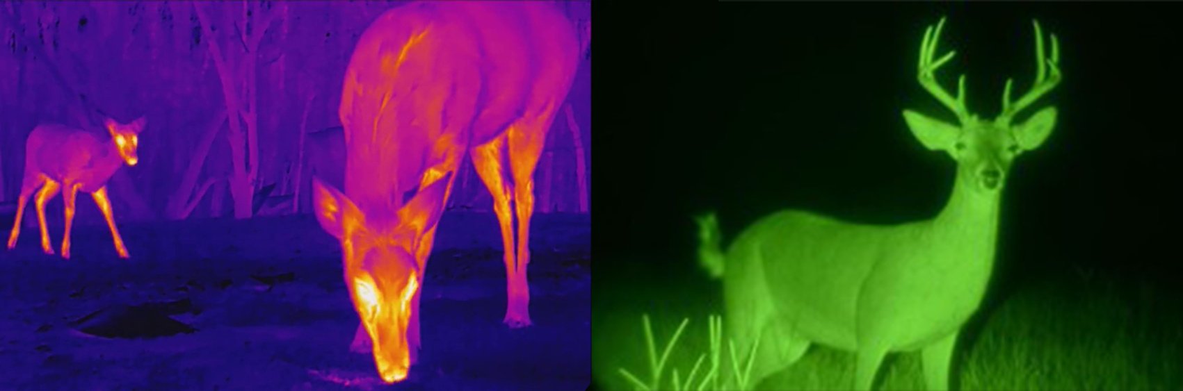 Termovize je velmi efektivní při zjištění přítomnosti živého objektu díky výraznému teplotnímu kontrastu vůči okolí. Noční vidění naopak poskytuje více vizuálních detailů potřebných pro přesné určení toho, na co se díváme.