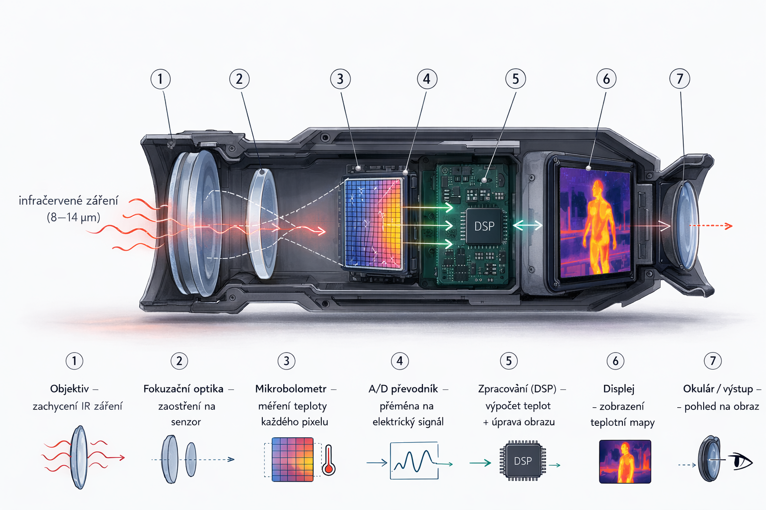 Důležitým parametrem je rozlišení senzoru, například 384×288 nebo 640×512 pixelů. Menší velikost pixelu, například 12 µm oproti 17 µm, obvykle umožňuje kompaktnější optiku a větší dosah při stejné velikosti objektivu. Dalším důležitým údajem je hodnota NETD (noise equivalent temperature difference), která vyjadřuje schopnost senzoru rozlišit malé teplotní rozdíly. Čím nižší hodnota, například pod 40 mK, tím citlivější je zařízení.