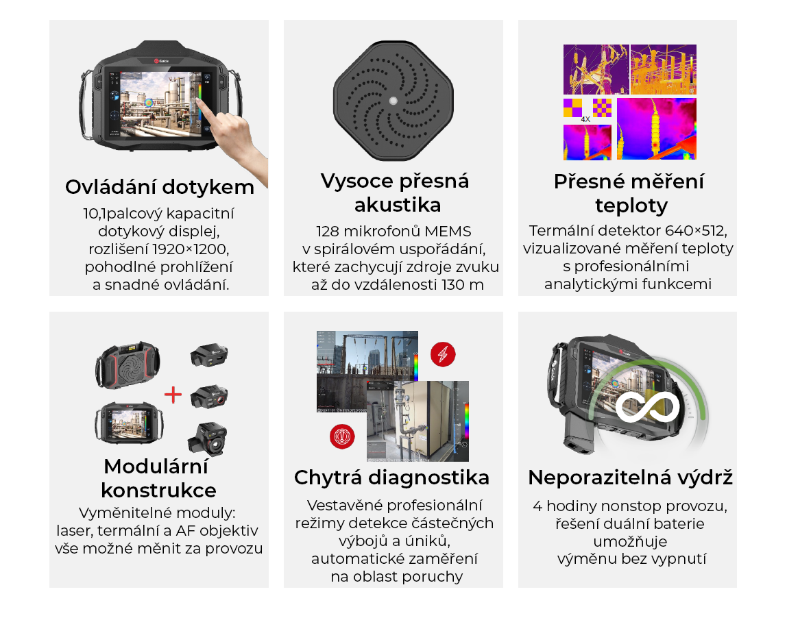 Systém využívá 128 nízkošumových MEMS mikrofonů uspořádaných do spiralového pole, které poskytují vysokou citlivost a přesné směrové vyhodnocení zdrojů zvuku. Díky širokému akustickému pásmu 0–65 kHz dokáže FA611 zachytit ultrazvukové projevy vznikající při částečných výbojích, netěsnostech v tlakovém vedení nebo unikajícím vzduchu a plynu. Kamera tak umožňuje lokalizovat poruchu přímo v terénu, a to i ve složitých provozních podmínkách s vysokou hladinou okolního hluku.